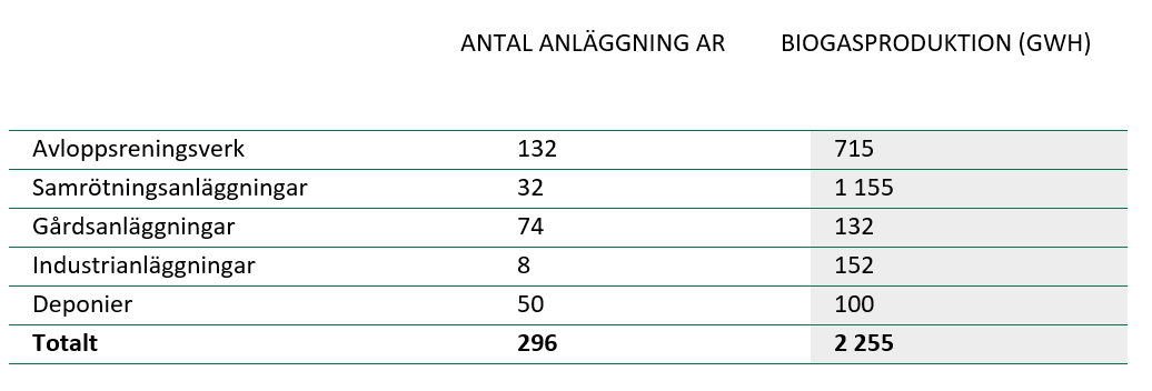 Den svenska produktionen kommer idag ifrån fem olika grupperingar enligt tabellen nedan. En stor del av produktionen går till att producera el och värme och här ser vi tydligt intresse från framför allt lantbruken att vilja komplettera med flytande biogas som bedöms som ett mycket mer attraktivt kommersiellt värde. Både kommunala avloppsreningsverk och samrötningsanläggningar utvärderar nu att producera flytande gas då den komprimerade gasens ökning har avstannat och tros minska i och med elektrifiering av bland annat taxi och stadsbussar. Av den producerade gasen facklas (eldas upp) cirka 8 procent av olika anledningar men hade med rätt planering kunnat omvandlas till flytande biogas i CryoSep anläggningar.